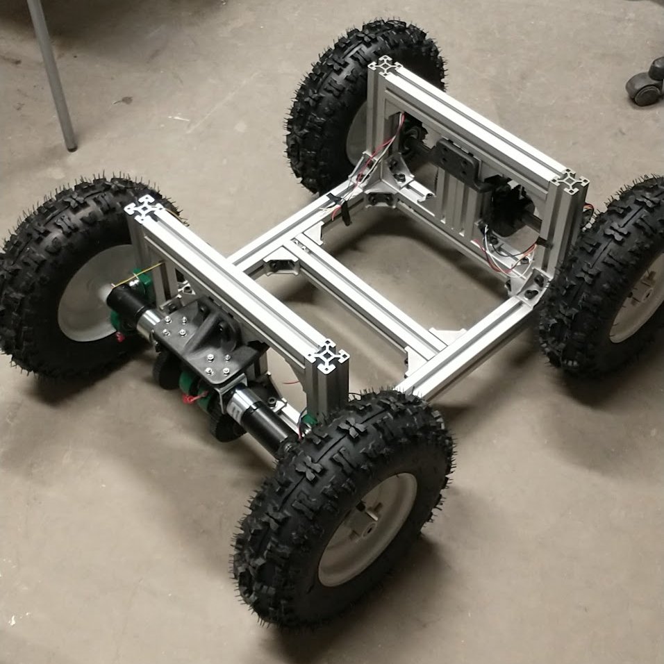 This is a photo in the end of the summer. It have no onboard computer and is turned on with a switch. The weight of the robot is around 50 kg, and have the battery capacity of 24 V 50 amp. The problem with this motor/gear design is that if it is in a certain angle it will start to accelerate and the motors can’t break it.