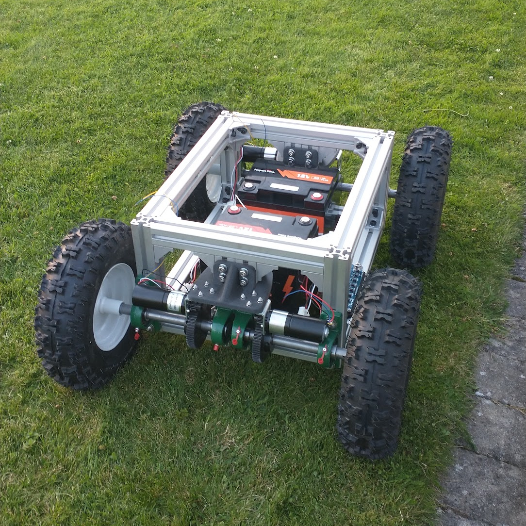 This is a photo in the end of the summer. It have no onboard computer and is turned on with a switch. The weight of the robot is around 50 kg, and have the battery capacity of 24 V 50 amp. The problem with this motor/gear design is that if it is in a certain angle it will start to accelerate and the motors can’t break it.