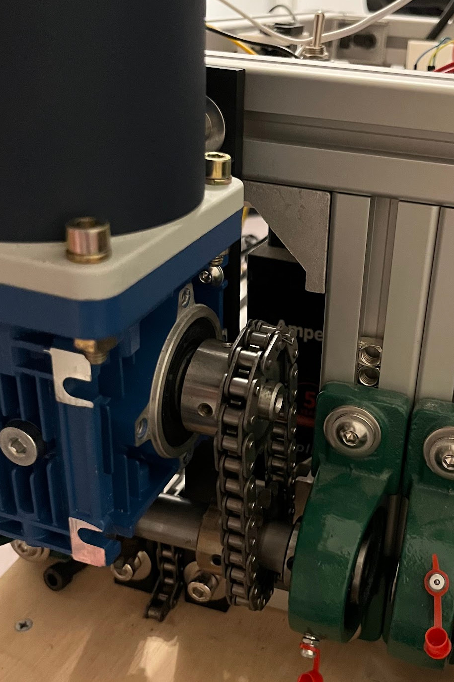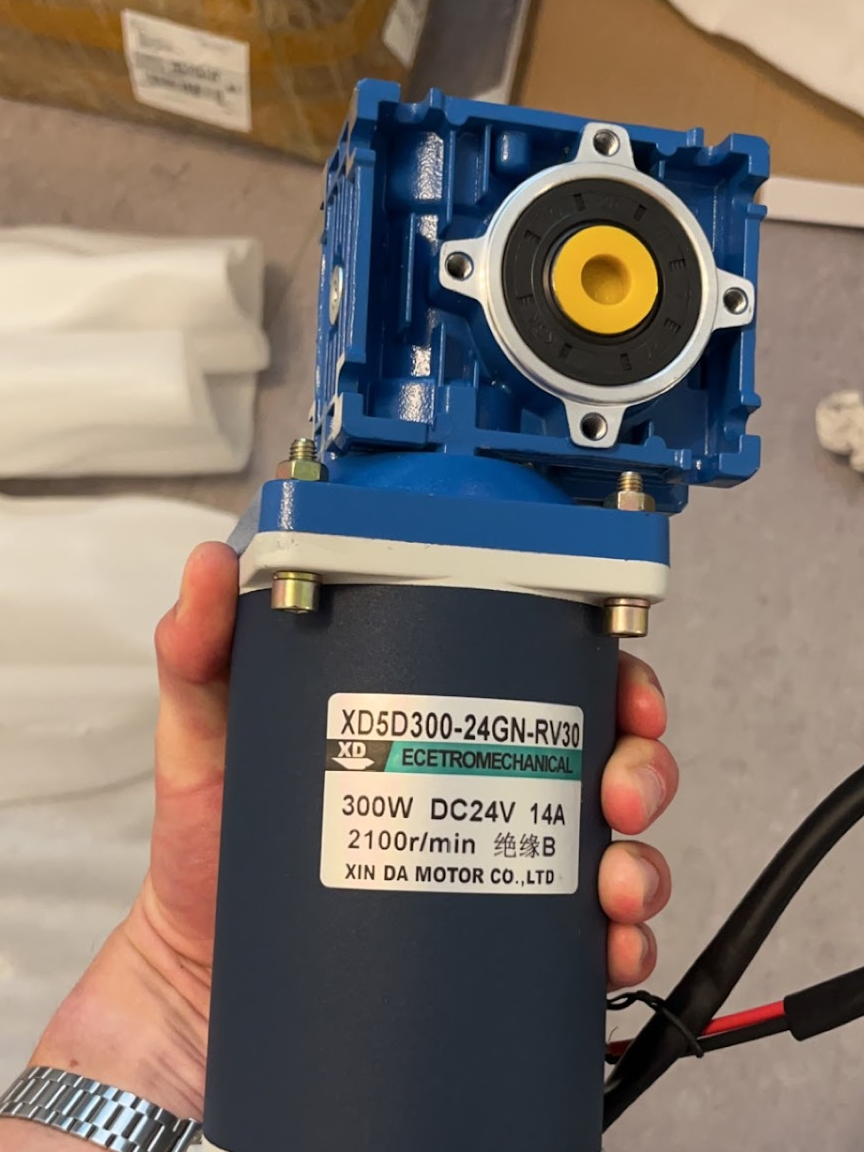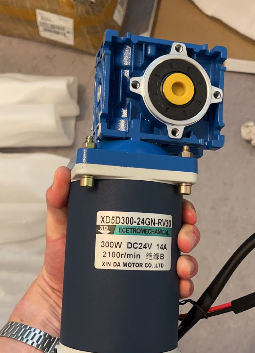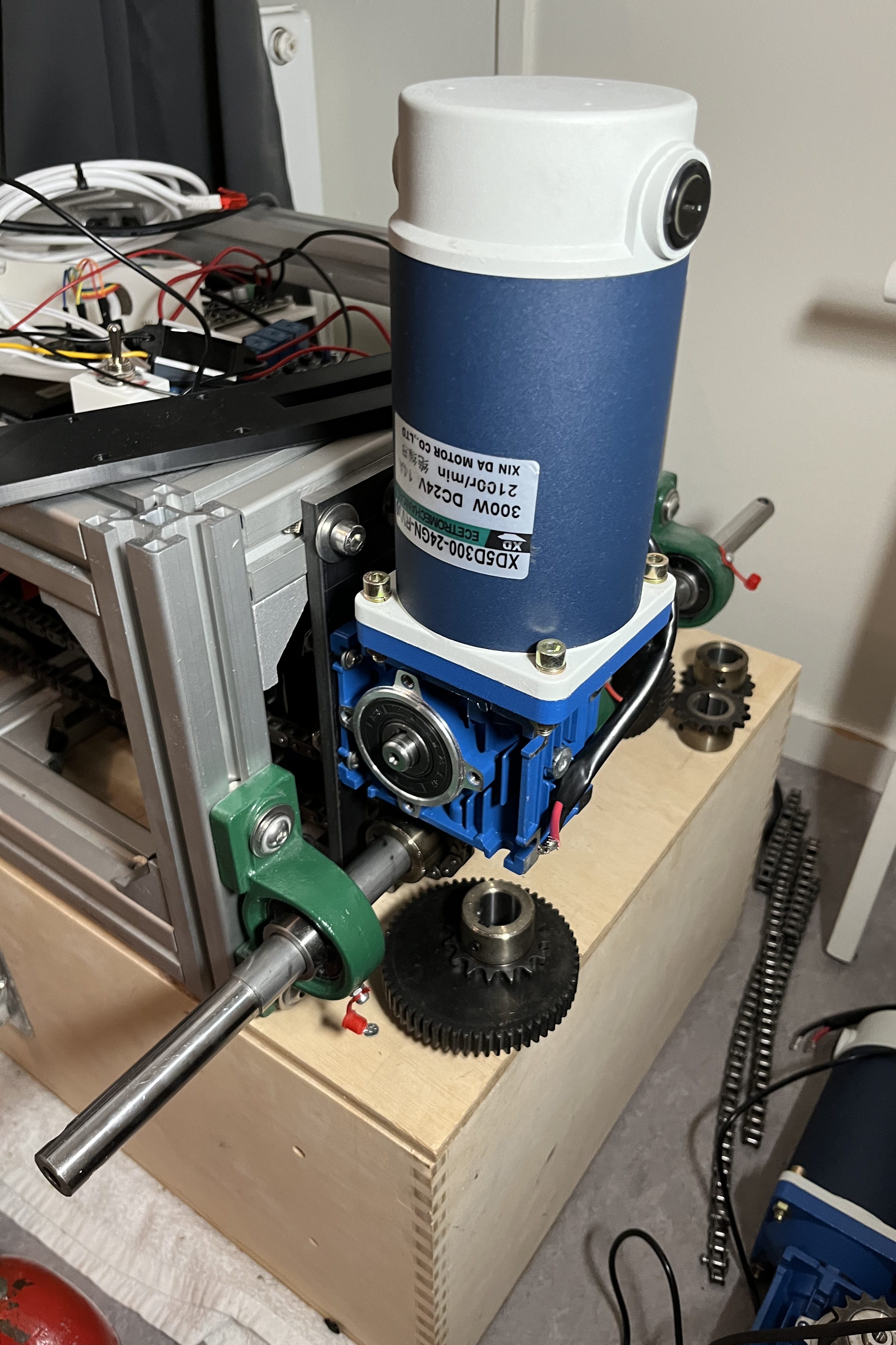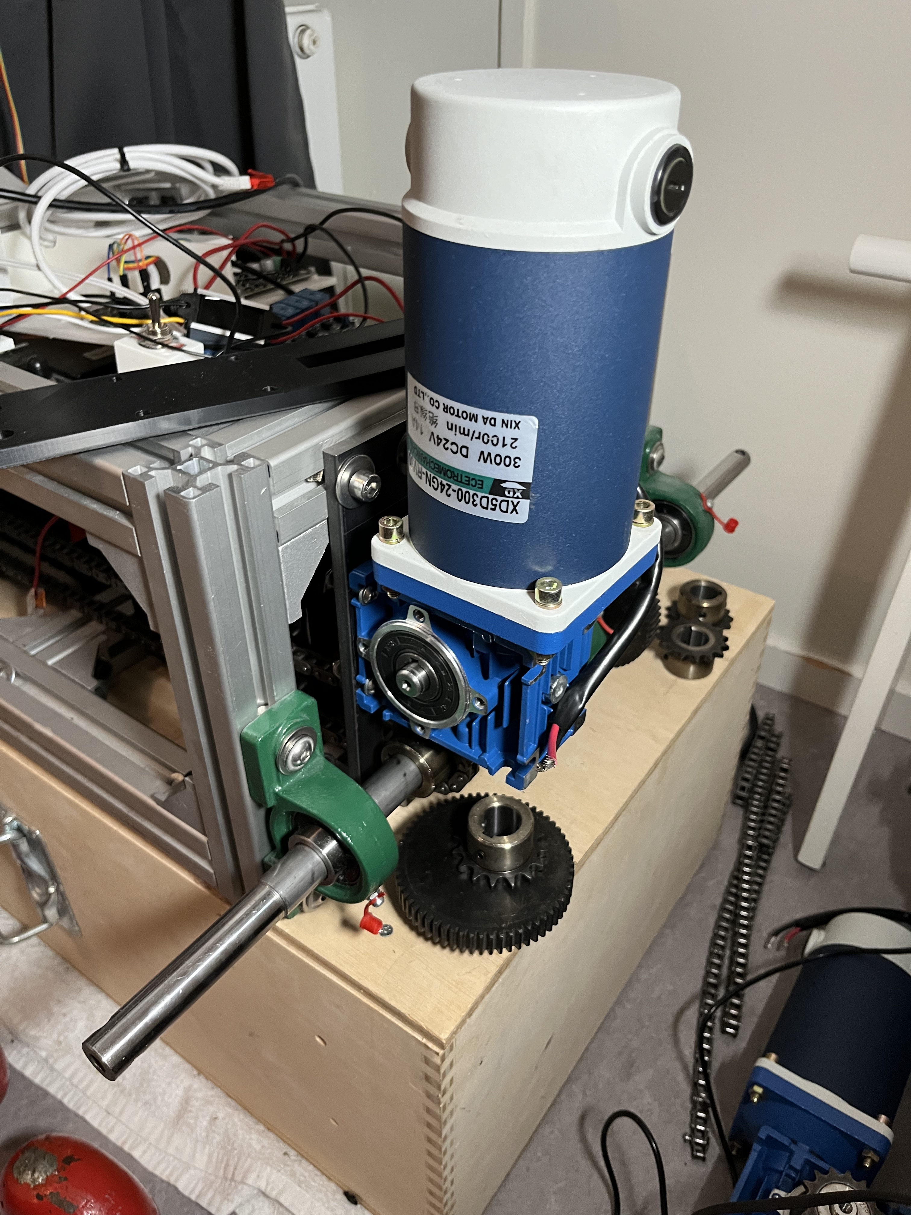 I was a bit surprised when the two 200-Watt motors with a worm gear gearbox I had ordered turned out to be 300-watt. The supplier had sent me the wrong ones, but I’m not complaining. Additionally, I received new gears and a chain, and I used them to fix the connections between each side and their respective front and back wheel axles.