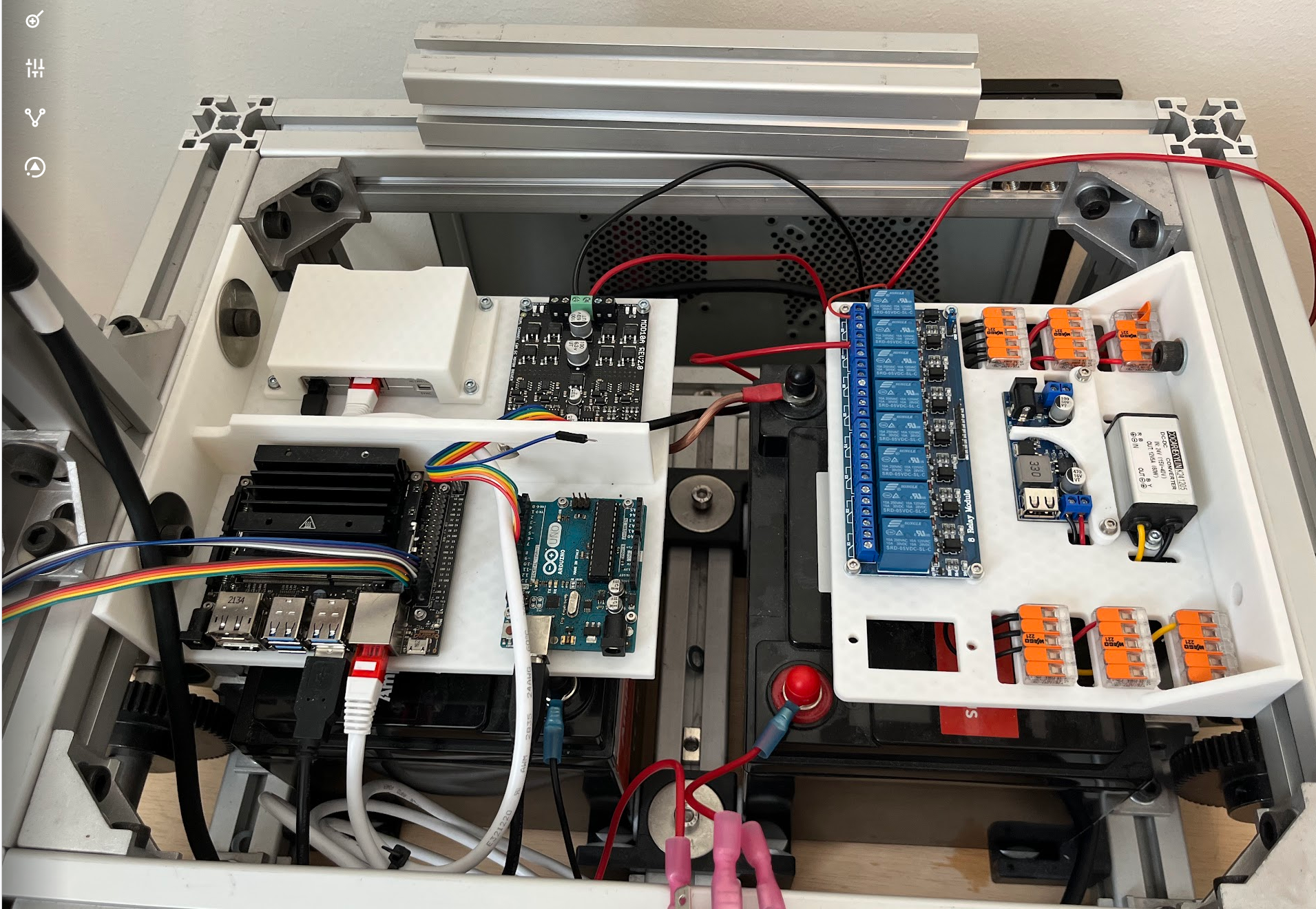 On the right board, there are two DC-DC converters (24-12 volt and 24-5 volt). There are two orange connectors, each with five slots for 24 volts, along with individual connectors for 12 and 5 volts. The board with the blue boxes hosts an 8-relay module, enabling me to manage power to various units such as the LiDAR, fans, etc, by toggling the relays.