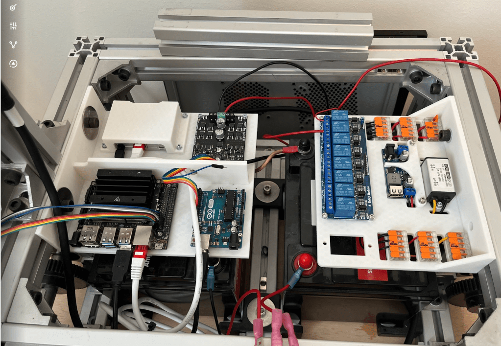 I designed two mounting boards to segregate the computing units and the connecting units. On the left board, the top left corner accommodates my Livox driver, connected to the LiDAR. Adjacent to it is the motor driver responsible for controlling the motors. Positioned at the bottom left is my Jetson Nano, serving as the main computer on the robot. Next to it, there’s an Arduino responsible for sending PWM signals to the motor driver.